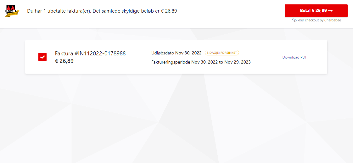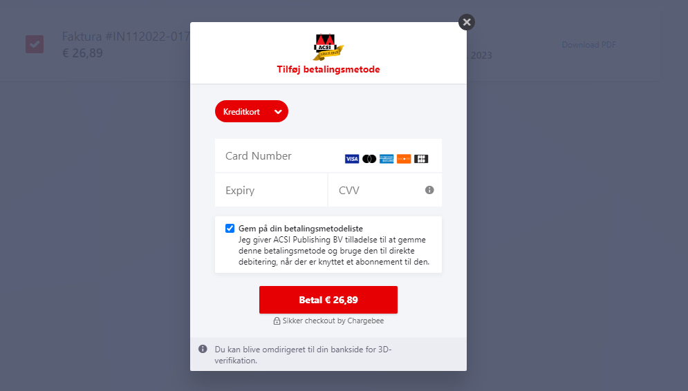 Betal for dit abonnement ved at klikke på den røde betalingsknap. Der åbnes nu en skærm, hvor du kan indtaste dine betalingsoplysninger og foretage betalingen.