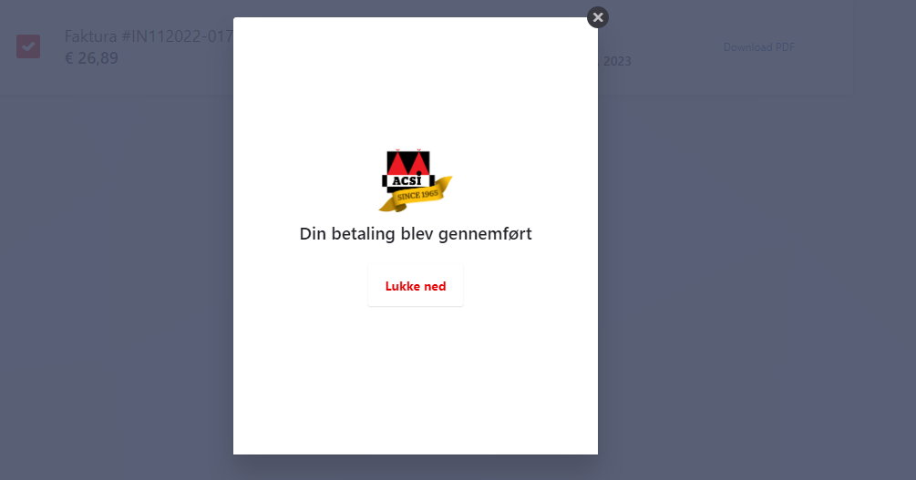 Når din betaling er lykkedes, vil du se følgende skærm. Du kan derefter lukke skærmen.