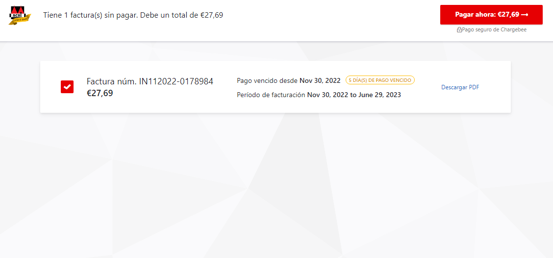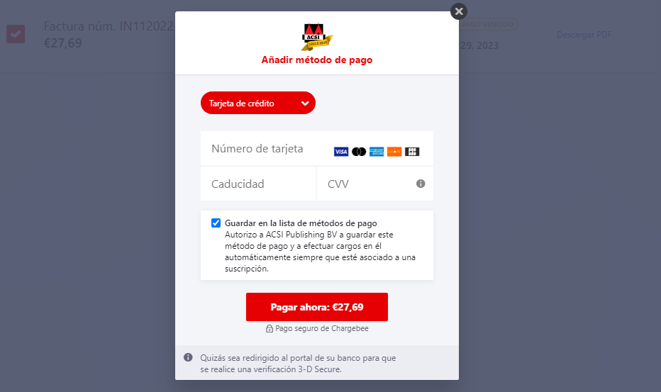 Abone su suscripción haciendo clic en el botón rojo de pago. Se abrirá una pantalla en la que puede introducir sus datos de pago y procesarlo.