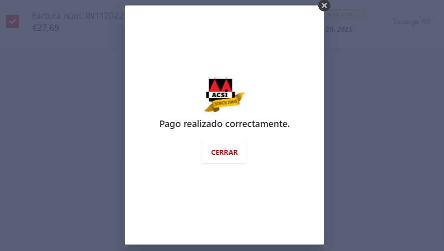Una vez realizado correctamente el pago, le aparecerá la siguiente pantalla. A continuación, ya puede cerrar la pantalla.