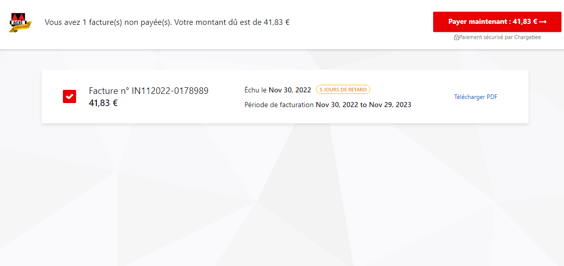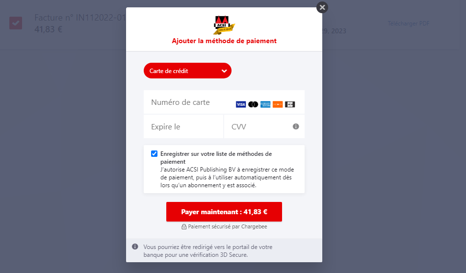 Vous avez reçu un email de notre part vous invitant à effectuer le paiement de votre abonnement à un produit ACSI. La gestion des abonnements s’effectue par le biais d’un nouveau système. Il est donc possible que la page de paiement ait un aspect différent de celui auquel vous êtes habitué. L’URL a également changé et débute désormais par https://acsipublishing.chargebee.com/.