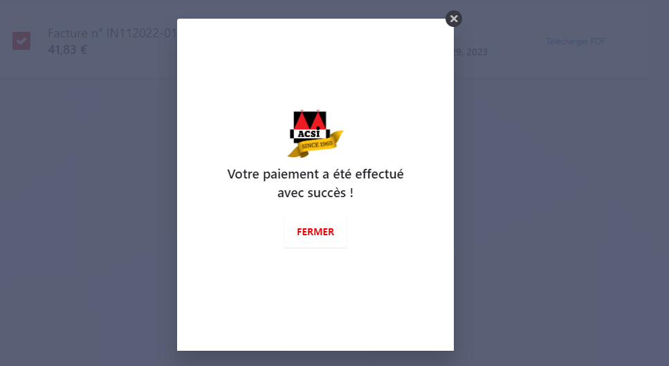 Dès que votre paiement est réussi, vous voyez la fenêtre suivante. Vous pouvez ensuite fermer la fenêtre.