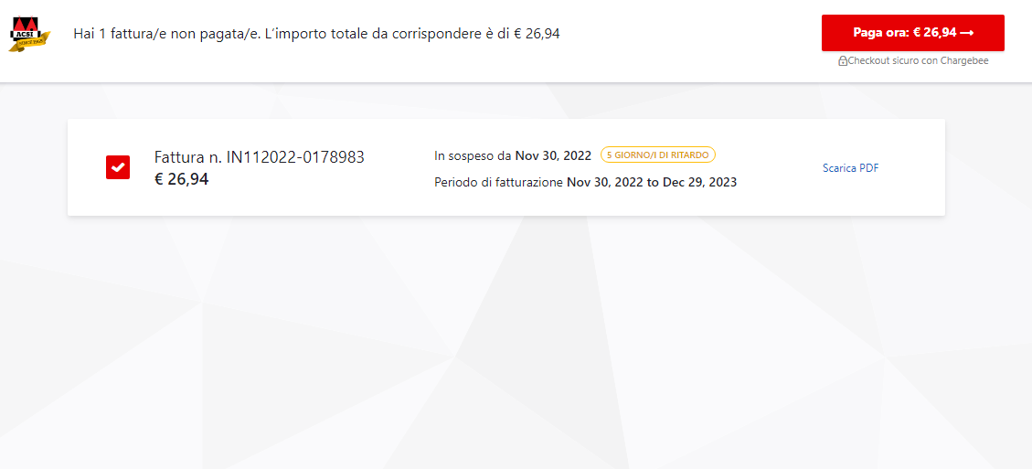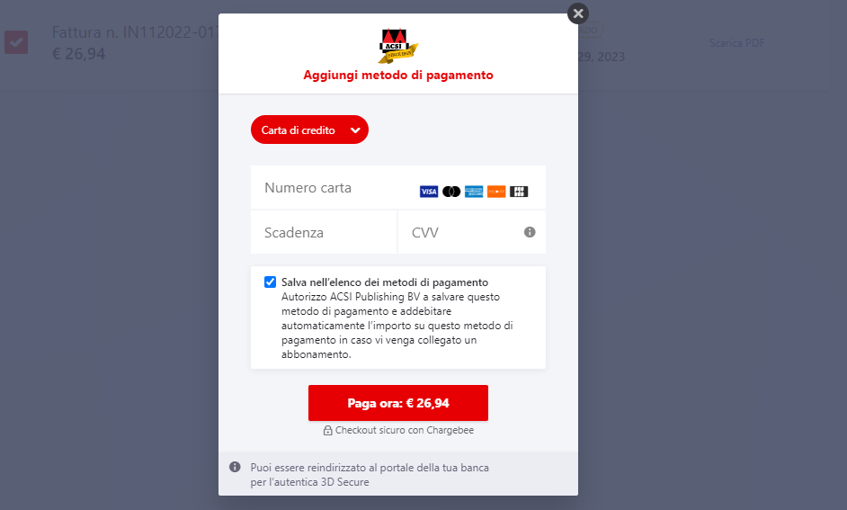 Le abbiamo inviato un’e-mail con la richiesta di pagare l’abbonamento di un prodotto ACSI. Per la gestione degli abbonamenti ci serviamo di un nuovo sistema. Forse per questo la pagina speciale del pagamento appare diversa da quella a cui è abituato. Anche l’URL è cambiato e d’ora in poi inizia con https://acsipublishing.chargebee.com/.