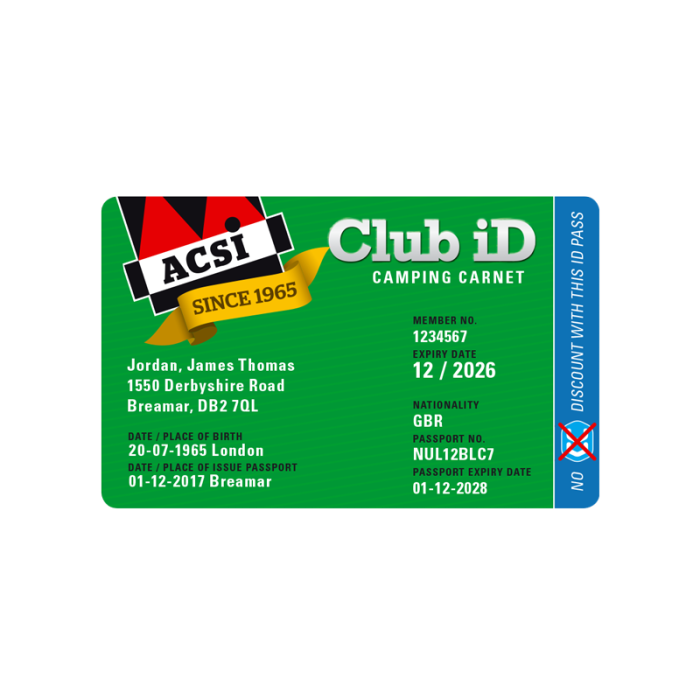 Med ACSI Club ID håller du ditt pass säkert i fickan. Nästan 8000 ACSI-campingar accepterar kortet som ersättnings-ID. Dessutom betalar du alltid det lägsta priset i vår webshop. Och det är inte allt. Med ACSI Club ID är du nämligen automatiskt ansvarsförsäkrad. Bli medlem och få fördelar direkt!